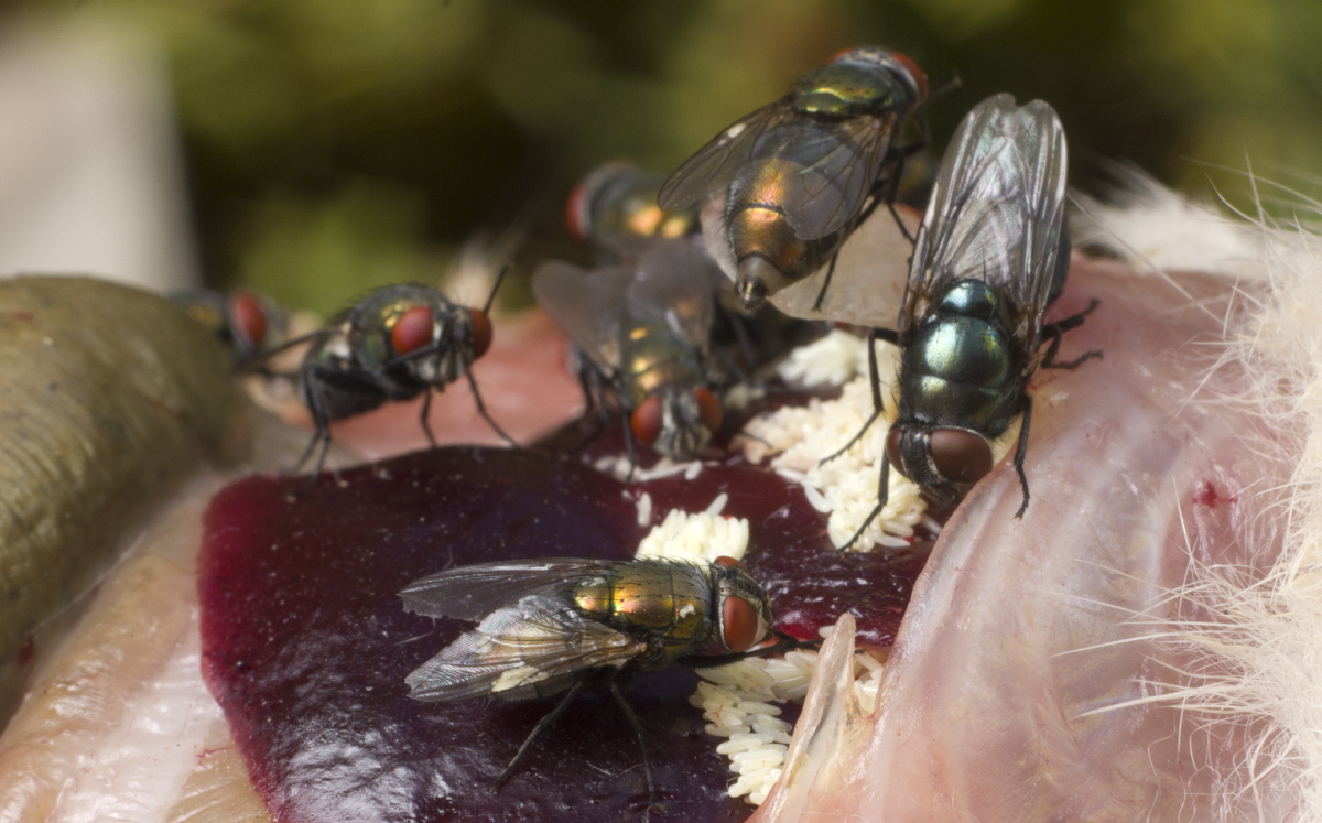 La mouche de la viande : également appelée mouche bleue ou verte de la viande, est une grosse mouche dont le corps se distingue par des reflets métalliques. On remarque souvent sa présence dans les maisons en hiver et au début du printemps. Cet insecte au vol bourdonnant se développe dans le fumier ou les carcasses d’animaux. Elle vole bien et elle est attirée par la lumière. Les excréments de chiens et les déchets captent également son attention.